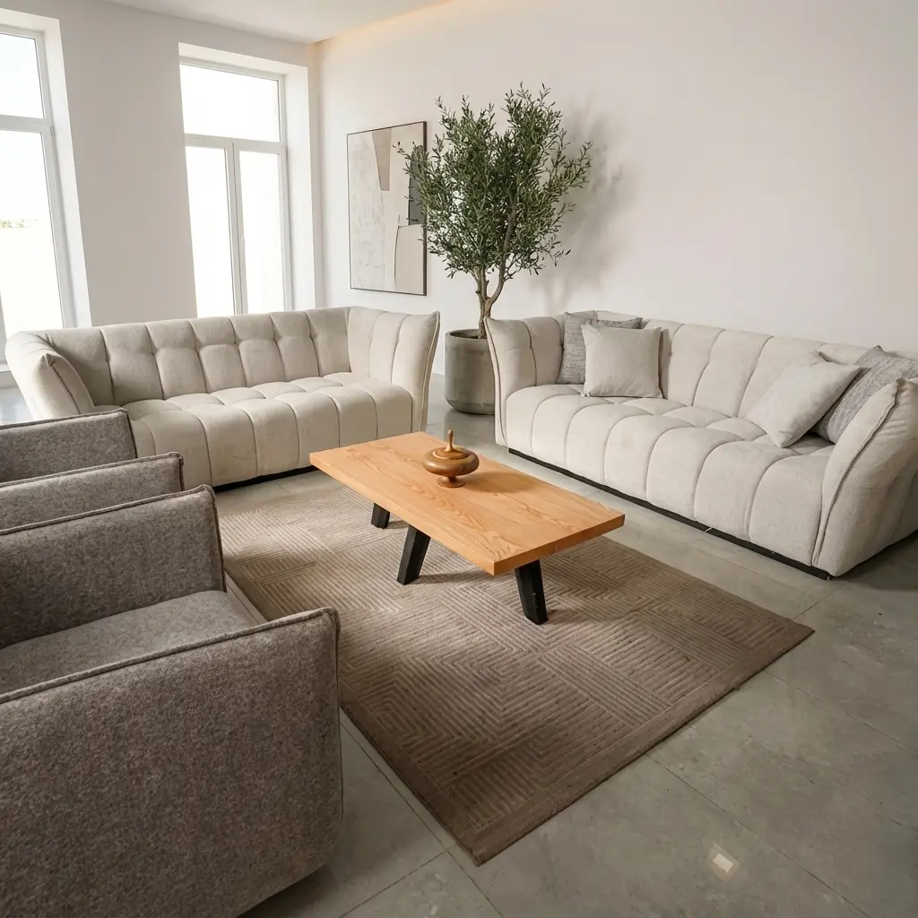 این ست مبلمان به دلیل داشتن پایههای چوبی نمایان و ساختار محکم، برای فضاهایی که تردد و استفاده زیادی دارند، مانند اتاق تلویزیون (TV Room) یا لابیهای شیک، کاربرد دارد. ترکیب پارچه و چوب در این محصول تعادلی بصری ایجاد کرده که از شلوغی فضا جلوگیری میکند و به دکوراسیون منزل شما نظم میبخشد.