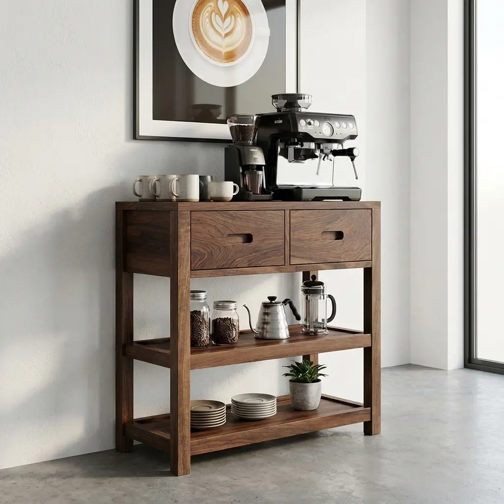 یکی از ویژگی‌های برجسته این مدل، وجود دو عدد کشو کاربردی است. این کشوها فضایی عالی برای نظم‌دهی به کپسول‌های قهوه، قاشق‌ها، دستمال‌ها و سایر ابزارهای کوچک هستند که معمولاً باعث شلوغی روی میز می‌شوند. در ساخت کشوها از یراق‌آلات باکیفیت شامل ریل‌های آرام‌بند استفاده شده است که حرکتی نرم و بی‌صدا دارند. همچنین دستگیره‌های چوبی طراحی شده برای کشوها، هماهنگی بصری کاملی با بدنه میز دارند و حس یکپارچگی را منتقل می‌کنند.