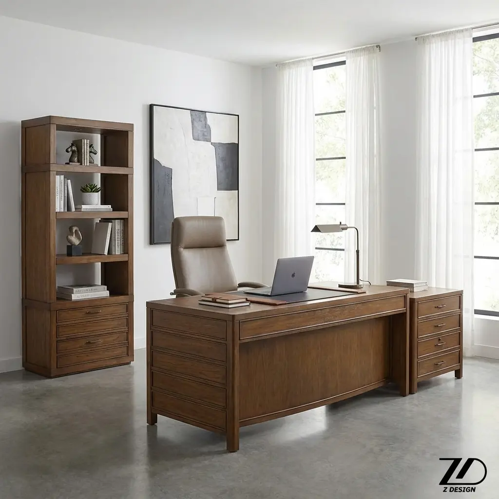 ست چوبی اداری شامل میز کاری، فایل کشودار و کتابخانه، به عنوان یک مجموعه کامل اثاثیه برای فضاهای اداری طراحی شده است. این مجموعه با ارائه فضای کاری منظم و مناسب جهت نگهداری اسناد و مدارک، امکانات اداری را تسهیل میکند. همچنین با طراحی زیبا و مدرن، به تزیین و بهبود ظاهر ادارهها و فضاهای کاری کمک میکند.