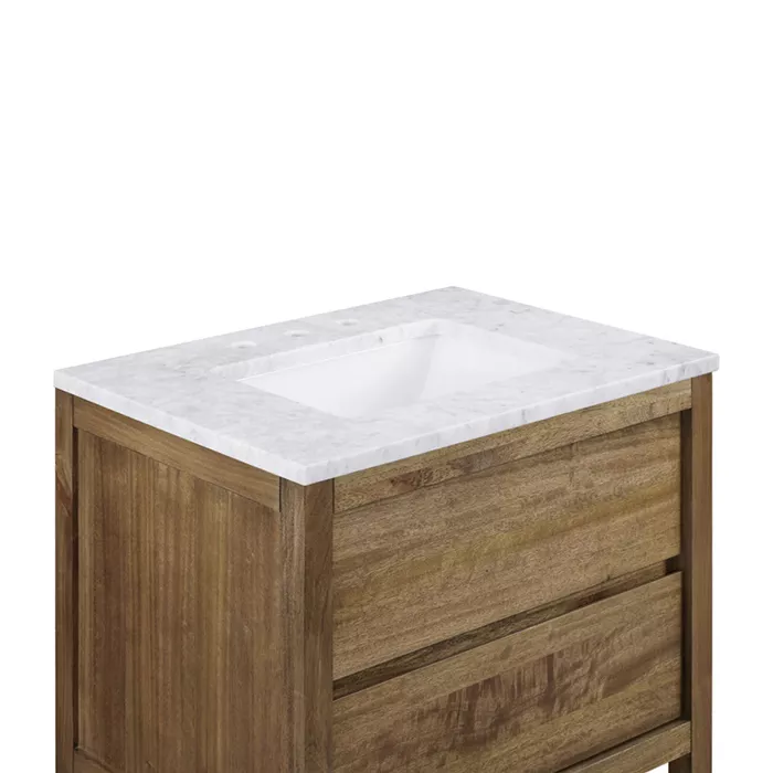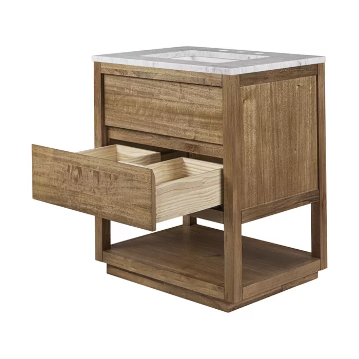 روی این بدنه چوبی مستحکم، صفحهای از جنس سنگ طبیعی چینی الیگودرز قرار گرفته است. ترکیب رگههای طبیعی چوب با براقیت و صلابت سنگ الیگودرز، تضادی چشمنواز ایجاد کرده است. همچنین، کاسه روشویی استفاده شده در این مدل از نوع زیر سنگی (Under-mount) و ساخت کشور ترکیه است که علاوه بر زیبایی، فضای مفید بیشتری را روی صفحه در اختیار شما قرار میدهد.