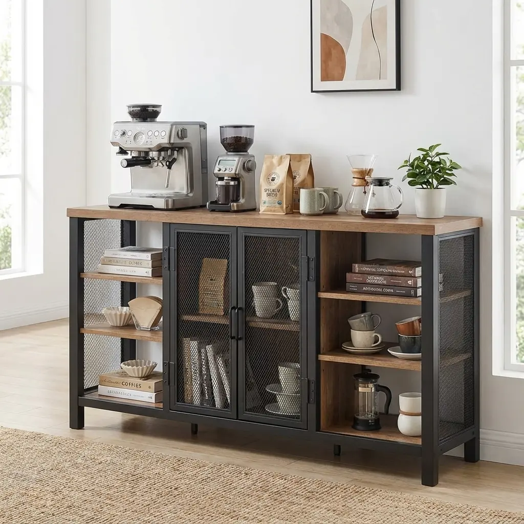 اگر به یک کافی بار خیلی زیبا احتیاج دارید که در خانه ای دیگر مشاهده نکنید می توانید این کافی بار را با خیال راحت انتخاب کنید. یکی از زیبا ترین کافی بار های را که دیده اید این کافی بار با درب های فلزی و طبقه های چوبی خاص است.