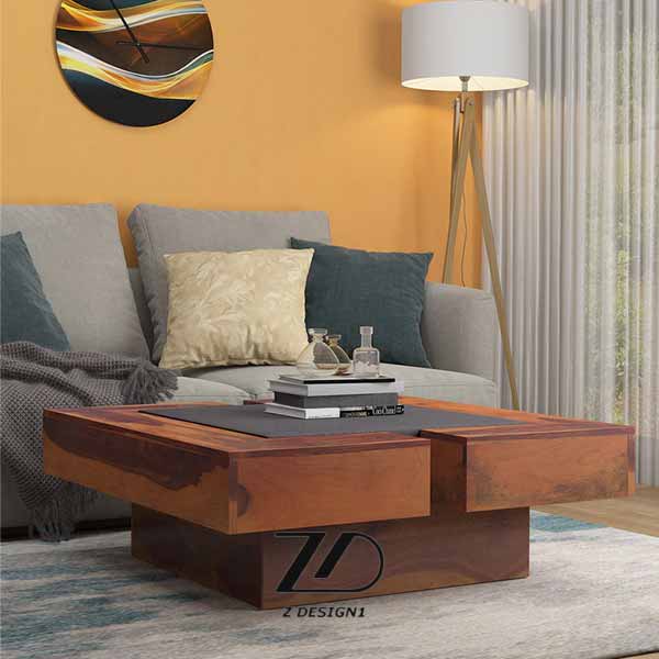 این میز جلو مبلی چوبی به عنوان میز ژاپنی نیز قابل استفاده می باشد. فرم کلی این میز جلو مبلی T شکل است که سطح آن مربع شکل است در وسط آن از روکش چرم رویه کوبی شده استفاده شده و پایه میز هم به شکل مکعب مربع می باشد.