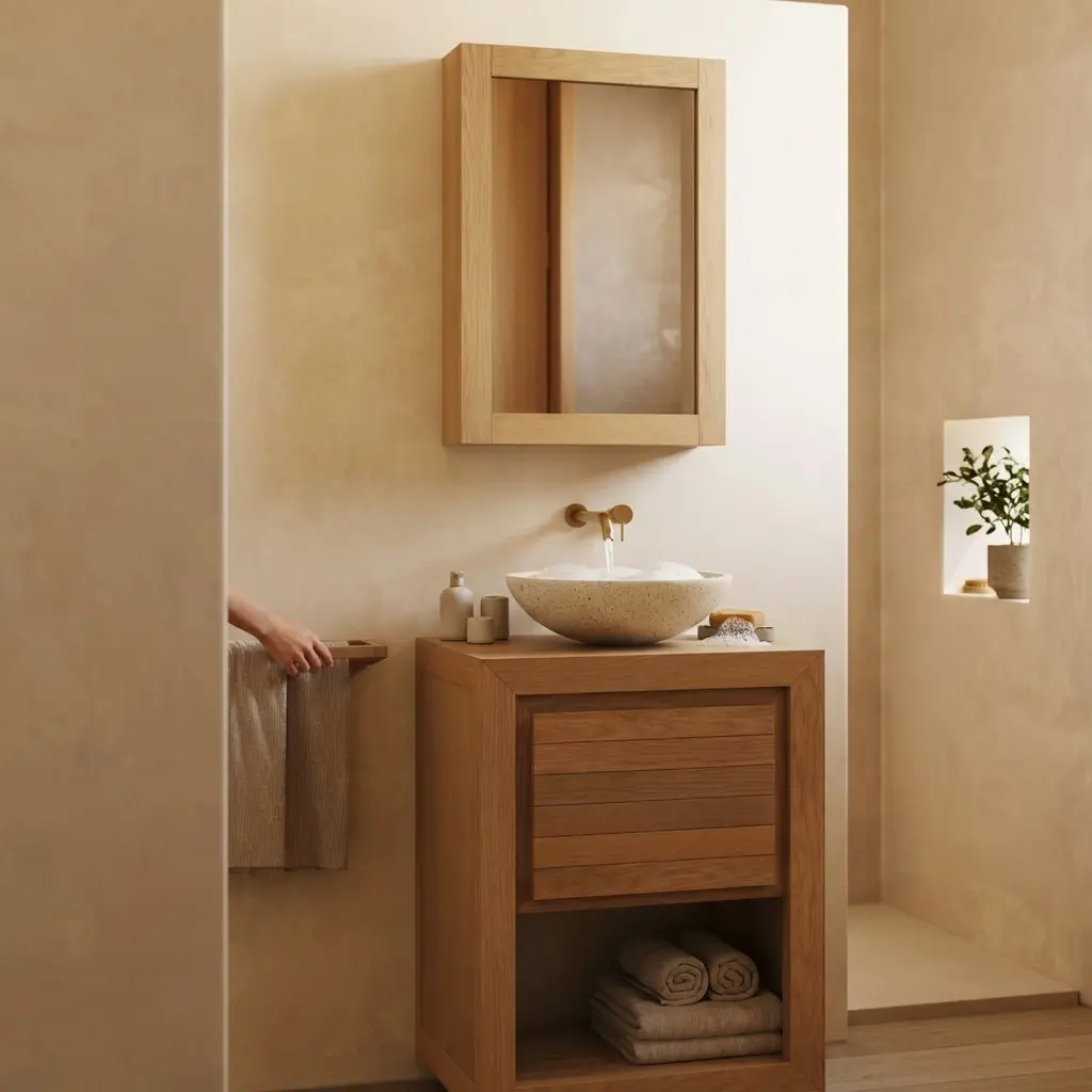 روشویی چوبی جولیا یک انتخاب هوشمندانه برای کسانی است که به دنبال تلفیق گرما و اصالت چوب با کارایی مدرن در فضای سرویس بهداشتی هستند. این محصول با طراحی ایستاده و ساختاری منسجم، به راحتی میتواند نقطه کانونی دکوراسیون حمام یا سرویس بهداشتی شما باشد. در طراحی مدل جولیا تلاش شده تا علاوه بر زیبایی بصری، کاربرد روزمره نیز در اولویت قرار گیرد. وجود یک رویه سرامیکی توکار در کنار گرمای چوب طبیعی، تعادلی چشمنواز ایجاد کرده که هم برای دکوراسیونهای مدرن و هم برای فضاهای کلاسیک مناسب است. اگر به دنبال محصولی هستید که هم جنبه دکوراتیو داشته باشد و هم دوام بالا، این مدل میتواند گزینهای ایدهآل برای شما باشد.