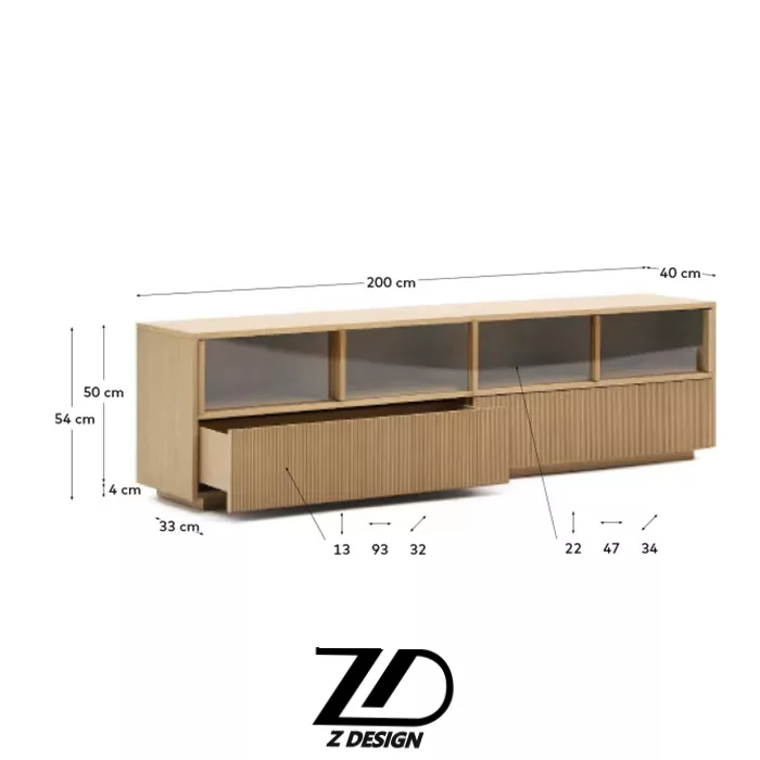 - ابعاد کاربردی: با طول ۲۰۰، عرض ۴۰ و ارتفاع ۵۰ سانتیمتر، این میز فضای کافی برای چیدمان دستگاههای جانبی و اکسسوریها را فراهم میکند و ارتفاع آن برای تماشای تلویزیون در حالت نشسته کاملاً ارگونومیک است.