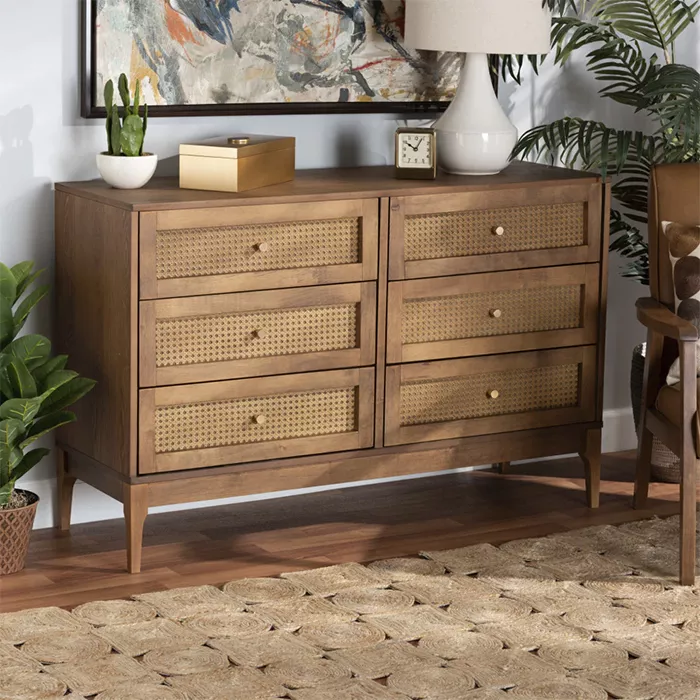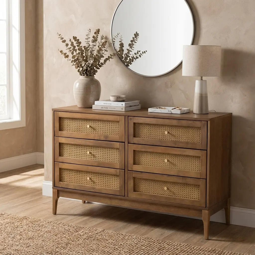 طراحی این دراور به گونهای است که محدود به اتاق خواب نمیشود. به دلیل ظاهر شیک و ترکیب چوب و حصیر، میتوانید از آن در فضای نشیمن یا راهروهای ورودی بزرگ نیز به عنوان یک کنسول کاربردی استفاده کنید. این مدل به خوبی با سبکهای دکوراسیون بوهو (Boho)، روستیک، ساحلی و حتی مینیمال هماهنگ میشود. گرمای رنگ چوب راش و بافت ارگانیک حصیر بامبو، خشکی فضاهای مدرن را گرفته و روحی تازه به چیدمان منزل میبخشد.
