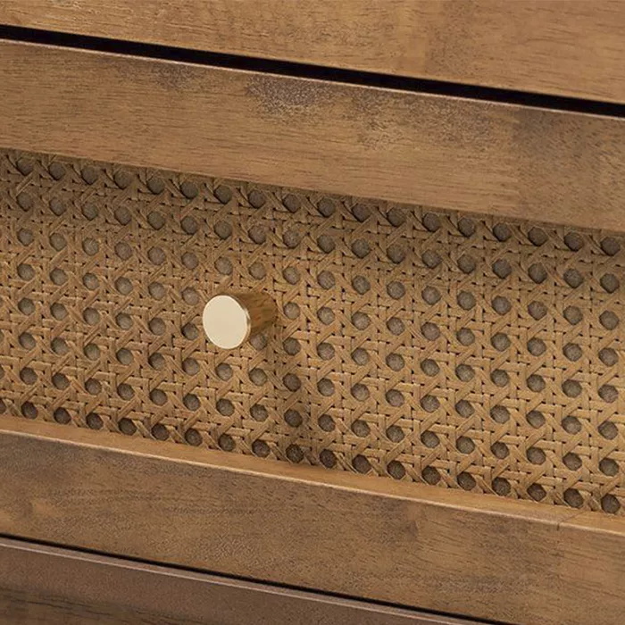 در ساخت دراور چوب و حصیر سباسین، کیفیت و ماندگاری اولویت اصلی بوده است. بدنه اصلی این محصول از چوب با روکش راش ساخته شده که به دلیل بافت گرههای طبیعی و استحکام بالا، یکی از محبوبترین متریالها در صنعت نجاری محسوب میشود. استفاده از حصیر بامبو در نمای کشوها، تضاد بافتی زیبایی با سطح صاف چوب ایجاد کرده و ظاهری منحصربهفرد به آن بخشیده است.