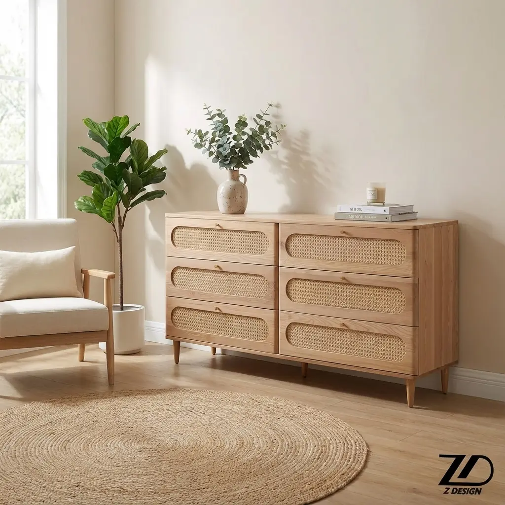 دراور شش کشو حصیری شمیم یک انتخاب هوشمندانه برای کسانی است که به دنبال ایجاد فضایی گرم، منظم و در عین حال مدرن در اتاق خواب خود هستند. این محصول با طراحی خاص خود که تلفیقی از بافت طبیعی چوب و هنر حصیربافی است، نه تنها به عنوان یک فضای ذخیرهسازی لباس عمل میکند، بلکه به عنوان یک المان دکوراتیو شاخص، جلوهای بصری فوقالعادهای به دکوراسیون داخلی میبخشد. طراحی این دراور به گونهای است که با داشتن شش کشوی جادار، تمام نیازهای شما برای طبقهبندی وسایل را برطرف کرده و در عین حال با ابعاد استاندارد خود، تناسب بصری اتاق را حفظ میکند.