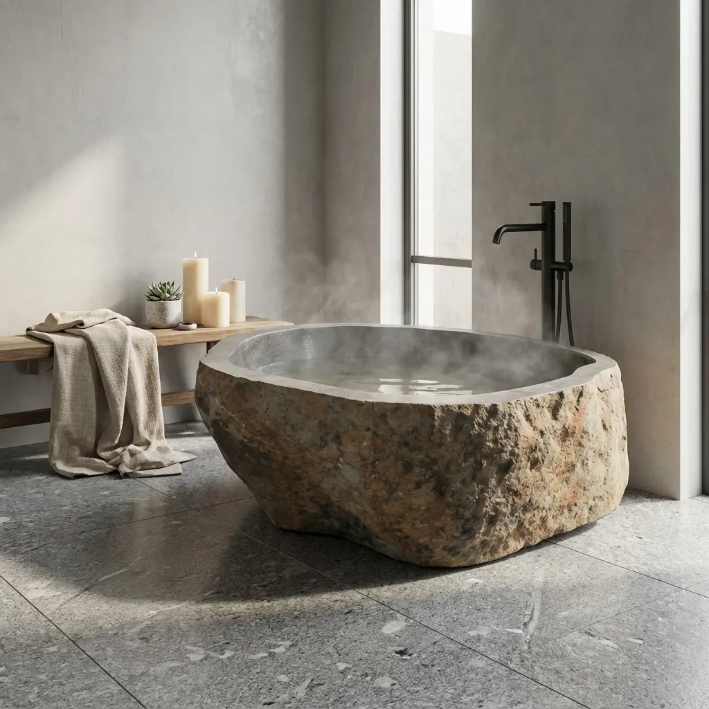 وان حمام روستیک در مجموعه ی زد دیزاین ، از سنگ های بزرگ رودخانه ایی ساخته شده اند . این وان ها بسیار خاص و منحصر بفرد هستند . تمامی مراحل ساخت وان به صورت یدی و با دست ساخته میشوند . به جهت روستیک و طبیعی بودن از هر نمونه وان تنها یک عدد در انبار شرکت موجود می باشد .