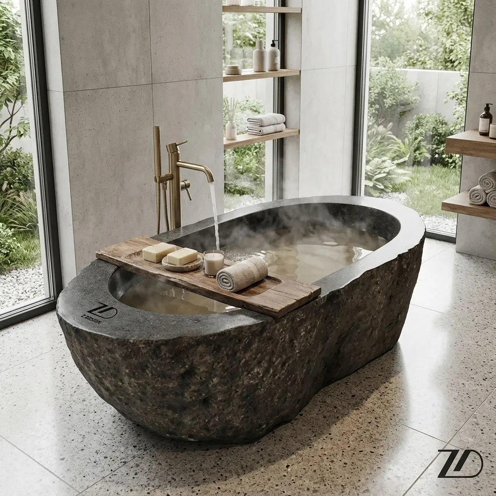 به جهت طبیعی و روستیک بودن این سنگ ها و این که هیچ گونه تراش اضافی بر روی سطح بیرونی آن ها نمی خورد ، زیبایی این وان حمام خاص چند برابر شده است .